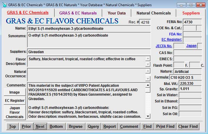 Whats New or been Updated in Flavor-Base - 10th Edition? GRAS & EC Flavor Chemicals Flavor-Base includes the complete listing of Flavor chemicals on the FDA & FEMA GRAS Lists to 2016 plus all flavor chemicals on the EC Register List. You may now also access the EC Flavouring Register list (with updates) from the GRAS & EC Flavor Chemicals screen providing you have installed the Adobe Reader. In addition, the 10th edition includes an indication of suitability for use in Japan along with pdf files of the Japanese Flavor Regulations and Japanese Food law. Flavor chemicals are cross referenced to the EC Flavis numbers and to JECFA numbers (with the latest JECFA toxicological summary information). In addition, citations and examples of use from the last 55 years of patent literature are now included in this database. Molecular structures and other properties for all flavor chemicals are provided. These additions increase the number of flavor chemicals to about 4324. And over 1000 additional organoleptic evaluations have been added. All flavor chemicals from FEMA GRAS lists 26 & 27 are also included - all with pertinant flavor information. GRAS & EC Natural Flavor Materials now contains all materials on the FEMA & FDA GRAS Lists plus the natural materials on the Council of Europe List. This database now contains 954 materials with extensive background information on usage and the botanicals habitat. Many items have details of the chemical composition. Several hundred gas chromatography analyses are given. Photos or illustrations for each of the botanicals are provided. All flavor materials from FEMA GRAS lists 26 & 27 are also included - all with pertinant flavor information. Bibliography a bibliographic database file containing over 5,360 references to pertinent flavor literature. Odor Thresholds This file of 995 GRAS & EC flavor chemicals is one of the most extensive compilation of such Odor & Flavor thresholds ever published. This file provides both the range of thresholds in various media (e.g., water, orange juice, beer, wine, oil, etc.) and provides a reference number that corresponds to those in the file "Threshold References". Odor Activity Value/Flavor Units The so-called ODOR ACTIVITY VALUE or FLAVOR UNIT values can be generated from the "GRAS Flavorants in PPM in Foodstuffs" file. By accessing the "Odor Activity/Flavor Unit" query or report, one can generate both the reported concentrations and the Odor Activity/Flavor Unit value for all chemicals in a foodstuff for which a detection threshold value is given. The Odor Activity/Flavor unit value provides an indication of the chemicals contribution to the foodstuffs flavor/aroma. Thus, a very minor constituent that may be a major flavor contributor can quickly be identified by this technique. FDA Direct Food Additives This file contains material on direct food additives approved by the U.S. Food & Drug Administration (FDA) which appear in Title 21, Code of Federal Regulations (CFR), sections 1 to 199, plus the numerous GRAS food additives approved by FDA (e.g., potassium benzoate) which are not listed in the CFR. Current to early 2016. Materials are cross referenced with European "E" numbers. The complete original text of the Title 21, Code of Federal Regulations (CFR), sections 1 to 199 are provided as pdf files. European Community List This file contains food additives approved by the European Commission. The 370+ materials with "E" numbers are listed with functionality and permitted uses and use levels as specified in the new Regulation 1333/2008 (and the related amendments, Regulations 1130/2011, 1131/2011, 231/2012, 232/2012, 380/2012, 570/2012, 583/2012, 675/2012, 1049/2012, 1050/2012, 1057/2012, 1147/2012, 1148/2012, 1149/2012, 1166/2012, 25/2013, 244/2013, 256/2013, 438/2013, 497/2013, 509/2013, 510/2013, 723/2013, 738/2013, 739/2013, 816/2013, 817/2013, 818/2013, 913/2013, 1068/2013, 1069/2013, 1274/2013, 59/2014, 264/2014, 298/2014, 497/2014, 505/2014, 506/2014, 601/2014, 685/2014, 923/2014, 957/2014, 966/2014, 969/2014, 1084/2014, 1092/2014, 1093/2014, 2015/463, 2015/537, 2015/538, 2015/639, 2015/647, 2015/649, 2015/826, 2015/1378, 2015/1725, 2015/1739 & 2015/1832; this now contains the comprehensive listing of permitted additives and their permitted uses through 2015 ). Copies of the EU Food Regulations are also provided as pdf files. Materials are cross referenced with FDA numbers from Title 21 of the U.S. CFR and/or FEMA & COE numbers. GRAS Flavorants in Parts Per Million of Foodstuffs This file now contains the approximate quantitative composition of GRAS chemicals reported present in 180 foodstuffs and contains nearly of 6611 entries in a colorful and easy to use interface screen. Now when in browse, query or report mode it also provides the general flavor description. Natural Occurrence of GRAS Chemicals in Products This file contains over 19,080 records of reported natural occurrence of GRAS chemicals in 295 foodstuffs and natural products. Now when in report mode it also provides the general flavor description. Sources For Natural Flavor Chemicals This file contains an updated listing of "Natural" flavor chemicals (over 4884 entries) which are commercially available along with supplier information. This file is also designed so that the user can add, edit and delete records on screen. Suppliers of Flavor Materials This file provides an updated listing of Flavor suppliers with email contacts, web pages, addresses and phone/fax numbers. This file is also designed so that the user can add, edit and delete records on screen. Colors This file is presented in a colorful and easy to use interface screen that quickly provides color regulatory status in major countries. Easily queried or reported by color or by country. The file includes the EU revisions as of early 2016. Title 21 - U.S. Code of Federal Regulations This database provides the COMPLETE SEARCHABLE TEXT of all regulations appearing in Title 21 CFR (sections 1 to