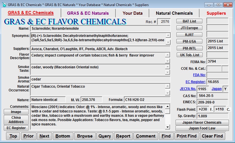 What's New or Updated in Flavor-Base "10th Edition" - Tobacco Version? GRAS & EC Flavor Chemicals Flavor-Base includes the complete listing of Flavor chemicals on the FDA & FEMA GRAS Lists (including GRAS List 26 & 27) plus all flavor chemicals on the EC Register List and the Japanese flavor lists as revised through mid-September 2015. These additions increase the number of flavor chemicals to about 4324. And over 1000 additional organoleptic evaluations have been added. You may now also access the updated Japanese & the new EU 2015 Flavourings Register lists from the GRAS & EC Flavor Chemicals screen providing you have installed the Adobe Reader. Flavor chemicals are also cross referenced to the Japan List, EC Flavis numbers and to JECFA numbers (with the latest JECFA toxicological summary information). The expanded database of "GRAS & EC Flavor Chemicals" also provides molecular structures and other properties. In addition, citations and examples of use from the last 55 years of patent literature are now included in this database. We have also included an extensive compilation of Flash Points for the various chemicals in both Fahrenheit and Centigrade units. The Tobacco Edition contains fields citing the latest available U.S. Tobacco Industry List, the U.K. List of permitted tobacco additives, the R.J. Reynolds tobacco additive list and the Philip Morris USA ingredient list - as well as the composite lists for Japan Tobacco International (Europe), BAT worldwide and Philip Morris International. For convenience, the composite files for each of the various Tobacco company "lists" are provided as Adobe Acrobat (pdf) files with direct web links to the source of these files (so that the user can see if the lists have changed). Smoking flavor evaluations are given for most materials used in the tobacco industry. GRAS & EC Natural Flavor Materials now contains all materials on the FEMA & FDA GRAS Lists plus all natural materials on the Council of Europe List. This database now contains 954 materials with extensive background information on usage and the botanicals habitat. Many items have details of the chemical composition. Several hundred gas chromatography analyses have been added. Photos or illustrations for each of the botanicals are provided. The presence of a material on the latest available U.S. Tobacco Industry List, the UK Tobacco additive List, the R.J. Reynolds tobacco additive list and the Philip Morris USA ingredient list - as well as the composite lists for Japan Tobacco International (Europe), BAT worldwide and Philip Morris International is indicated. Each of these lists are available for direct on-screen access. Smoking flavor evaluations are given for most materials used in the tobacco industry. Bibliography a bibliographic database file containing over 5,360 references to pertinent flavor literature up through late 2015. Odor Thresholds This file of 995 GRAS & EC flavor chemicals is one of the most extensive compilation of such Odor & Flavor thresholds ever published. This file provides both the range of thresholds in various media (e.g., water, orange juice, beer, wine, oil, etc.) and provides a reference number that corresponds to those in the file "Threshold References". Odor Activity Value/Flavor Units The so-called ODOR ACTIVITY VALUE or FLAVOR UNIT values can be generated from the "GRAS Flavorants in PPM in Foodstuffs" file. By accessing the "Odor Activity/Flavor Unit" query or report, one can generate both the reported concentrations and the Odor Activity/Flavor Unit value for all chemicals in a foodstuff for which a detection threshold value is given. The Odor Activity/Flavor unit value provides an indication of the chemicals contribution to the foodstuffs flavor/aroma. Thus, a very minor constituent that may be a major flavor contributor can quickly be identified by this technique. FDA Direct Food Additives This file contains material on direct food additives approved by the U.S. Food & Drug Administration (FDA) which appear in Title 21, Code of Federal Regulations (CFR), sections 1 to 199, plus the numerous GRAS food additives approved by FDA (e.g., potassium benzoate) which are not listed in the CFR. Current to September, 2015. Materials are cross referenced with European "E" numbers. The complete original text of the Title 21, Code of Federal Regulations (CFR), sections 1 to 199 are provided as pdf files. European Community List This file contains food additives approved by the European Commission. The 370+ materials with "E" numbers are listed with functionality and permitted uses and use levels as specified in the new Regulation 1333/2008 (and the related amendments, Regulations 1130/2011, 1131/2011, 231/2012, 232/2012, 380/2012, 570/2012, 583/2012, 675/2012, 1049/2012, 1050/2012, 1057/2012, 1147/2012, 1148/2012, 1149/2012, 1166/2012, 25/2013, 244/2013, 256/2013, 438/2013, 497/2013, 509/2013, 510/2013, 723/2013, 738/2013, 739/2013, 816/2013, 817/2013, 818/2013, 913/2013, 1068/2013, 1069/2013, 1274/2013, 59/2014, 264/2014, 298/2014, 497/2014, 505/2014, 506/2014, 601/2014, 685/2014, 923/2014, 957/2014, 966/2014, 969/2014, 1084/2014, 1092/2014, 1093/2014, 2015/463, 2015/537, 2015/538, 2015/639, 2015/647, 2015/649, 2015/826, 2015/1378, 2015/1725, 2015/1739 & 2015/1832; this now contains the comprehensive listing of permitted additives and their permitted uses through mid-October 2015 ). Copies of the EU Food Regulations are also provided as pdf files. Materials are cross referenced with FDA numbers from Title 21 of the U.S. CFR and/or FEMA & COE numbers. GRAS Flavorants in Parts Per Million of Foodstuffs This file now contains the approximate quantitative composition of GRAS chemicals reported present in 180 foodstuffs and contains nearly of 6611 entries in a colorful and easy to use interface screen. Now when in browse, query or report mode it also provides the general flavor description. Natural Occurrence of GRAS Chemicals in Products This file contains over 19